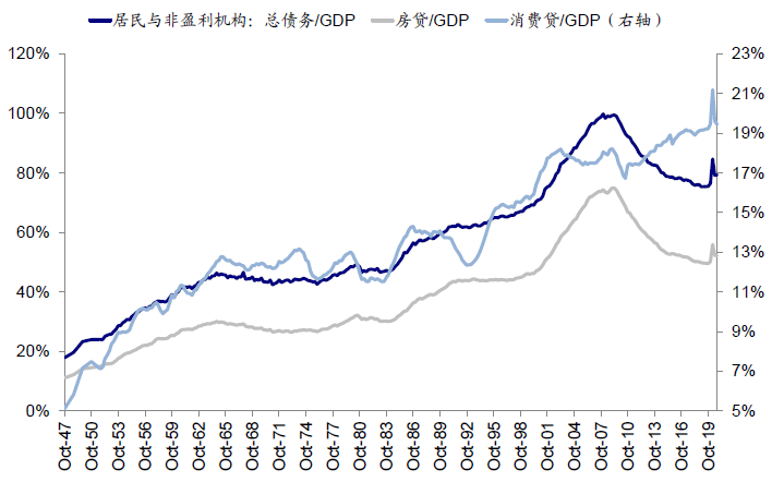 房贷是居民部门负债的主要构成,占居民负债65.8%。美国购房行为主要采取抵押贷款的融资形式,2020年四季度通过抵押贷款形式购买独栋房屋占比为69.0%。住房贷款也是居民负债端最重要的组成部分。虽然自金融危机后,房贷占居民负债比持续回落(除疫情以来的特殊情况),但2020 年四季度房贷占美国居民负债仍达到65.8%,远远高于消费贷(24.5%)。住房贷款的规模对居民资产负债表的健康程度有很大影响,决定了居民杠杆的高低。根据美联储数据,2020年四季度居民部门杠杆率为79.3%(较2019年 +3.89ppt),而居民部门信贷规模未显著扩张,抬升的杠杆主要由于GDP下降对分母的影响,当前居民资产负债表仍较为健康,长期的去杠杆过程为本轮加杠杆留足了空间。