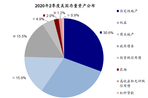 从整体规模看,住宅型房地产是美国规模最大的单一资产。根据美联储《金融稳定报告》,截至2020年2季度,美国住宅性地产存量规模为39.3万亿美元,占比全美资产约31%,其次为权益资产(37.2万亿美元),占比达29%。