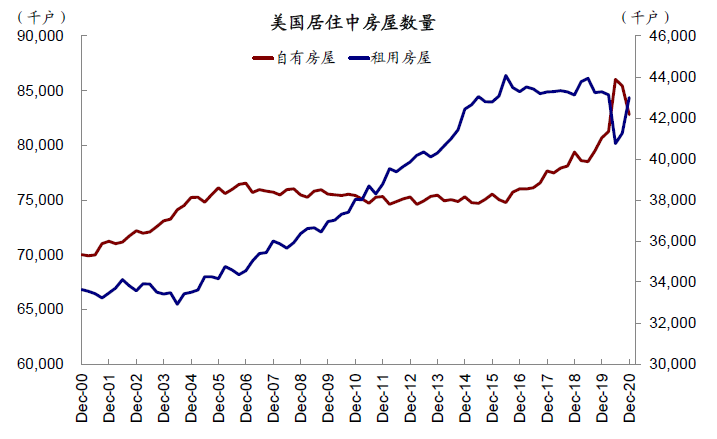 房屋空置率、房屋自住率是监测地产市场空间的主要指标。全美住宅型地产可以分为三个部分:空置房屋(Vacant)、居住中自有房屋(Owner Occupied)和居住中租用房屋(Renter Occupied)。其中统计中常用的住房自住率即为居住中自有房屋/所有居住中房屋。1)房屋空置率(空置房屋/所有房屋)可以用来衡量房地产长期供求关系和健康程度,空置率较高则证明房地产投资过度,泡沫化严重。当前空置房屋占比已经达到历史较低水平(10.9%),可以体现出房屋供给紧张的局面。2)房屋自住率衡量居住房屋中自有产权的占比,该比例从2016年起开始持续上升。除此之外我们也可以计算自住房屋数量/人口数量来简单衡量全美房屋拥有水平,该指标同样持续上升。3)自住和租房:在非空置房屋中,自有和租用的房屋数量在去除长期增长趋势后呈现反向变动,体现出购买和租房的需求互斥性。
