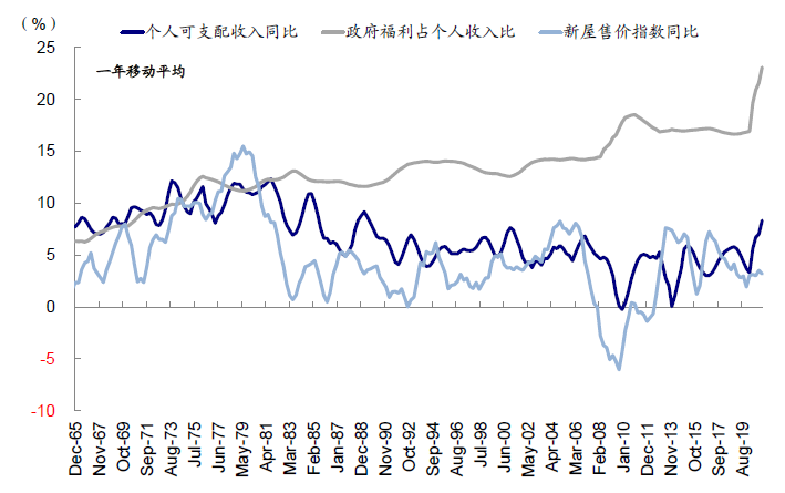 个人财富和杠杆水平高低决定需求是否可以转化为购买行动。在资产端,提升的个人可支配收入能够将购房需求转化为最终的购买行动。长周期看,个人可支配收入和房屋价格高度相关。同时,在经济复苏阶段,政府的转移支付通常会大幅增加以补充个人工资收入下滑的缺口,因此经济复苏下房地产市场通常能快速回暖。例如,本轮疫情下美国个人可支配收入实际上不降反升,2020年四季度美国个人可支配收入同比增速达到4.4%,而2020年二季度更是达到12.9%的高位,而政府转移支付占个人收入比从2019年末的16.8%大幅提升至2020年二季度27.8%的高点,为疫情后地产热提供了条件。