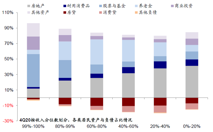 图表:按收入分位数划分,各类居民资产与负债占比情况