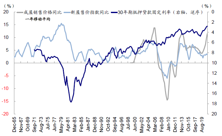 抵押贷款利率的高低决定了居民购房的利息成本。历史上抵押贷款利率的升降对房屋价格有明显的解释意义,且在一定程度上有领先性。本轮地产周期抵押贷款利率在2019年一季度就已经开始走低,房地产市场也随之开始了新一轮周期。
