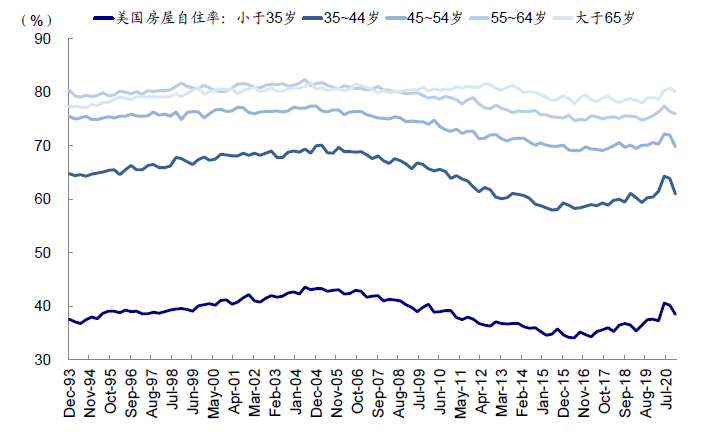 适龄置业主力人口占比是托底房地产市场的长周期因素。根据美国各年龄段房屋自住率(Homeownership Rate)数据看,35~44岁年龄段是美国主要的置业年龄,平均房屋自住率从36.6%提升至60.8%,能够体现出首套房的购置需求。购房需求主要产生于家庭组建(婚姻或搬离原有大家庭),长期来看,房屋销售与美国家庭数量的增速相匹配。