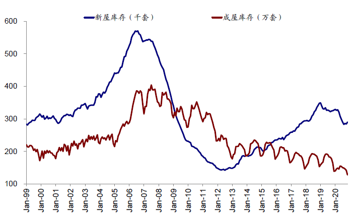 成屋的库存水平是最重要的指标。不同于新屋的先售后建,成屋销售过程中已经有了实体的房屋,且成屋市场总供给量在短期不会大幅改变,因此库存水平就成为成屋供给侧最重要的观测指标。当前成屋库存已经降至历史低位。