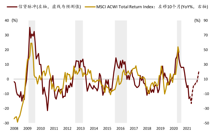 图表5:我国信贷脉冲领先全球股市10个月左右