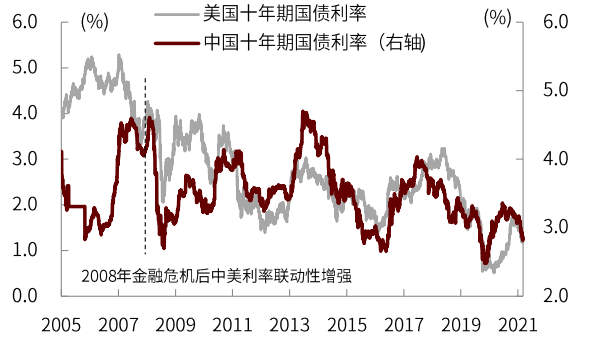 图表:美债利率与中国利率在金融危机后联动性明显增强