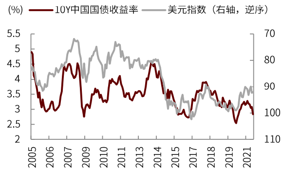 当美元指数走强、市场恐慌情绪上升时,中国利率债作为国内安全资产,市场配置需求增强,叠加央行可能相应放宽货币政策,中国国债收益率倾向于下行。
