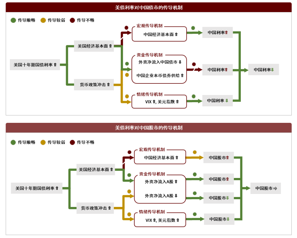 如果美债利率上行,是否会带动中国利率上行?是否会导致中国股市调整?仅根据中美资产价格历史相关性进行线性外推,或者套用金融学和经济学原理简单推导,可能是对一个复杂传导系统的过度简化,难以得出可靠结论。因此,我们构建了一套系统分析框架,以宏观传导机制,资金传导机制,情绪传导机制为主线,全面剖析了美债利率对中国股市和债市的不同传导渠道。对于每种资产和每条传导渠道,我们都推导出其方向和强度。加总不同传导渠道的影响,可以得出美债利率变动对中国资产的净影响。我们的分析显示,如果美债利率开始上行,中国利率仍可能保持下行趋势;中国股市或有扰动,但净影响相对有限,中国市场走出独立行情的可能性更大。下面具体讨论三种不同的传导机制。