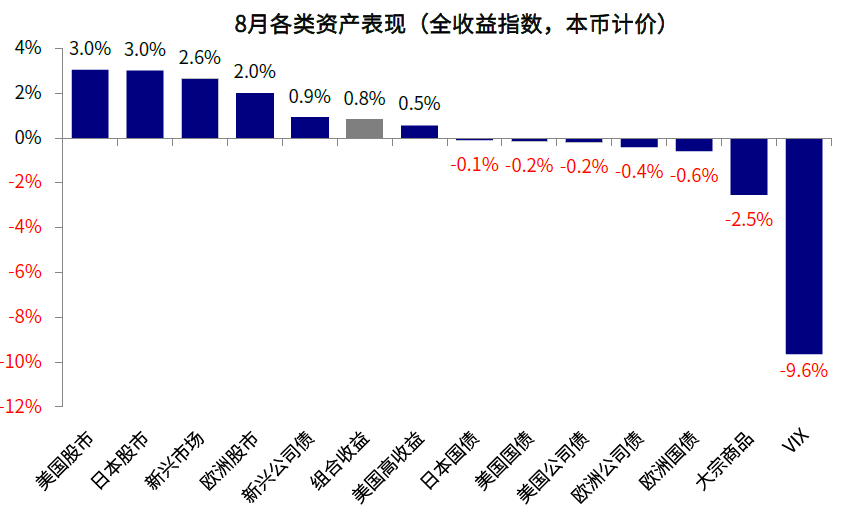 图表: 8月,美股以及新兴市场股市是组合8月上涨的主要贡献 ,VIX及大宗商品有所拖累