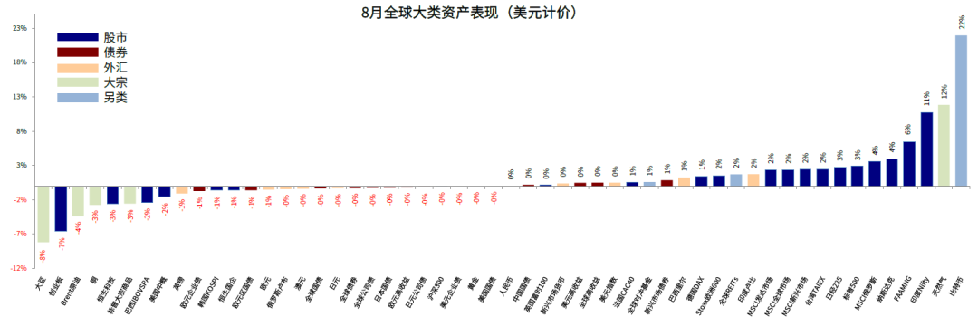 图表: 8月全球大类资产表现:美元计价下,股>债>大宗,比特币、天然气、印度股市、FAAMNG、纳斯达克领涨;大豆、创业板、原油、铜领跌