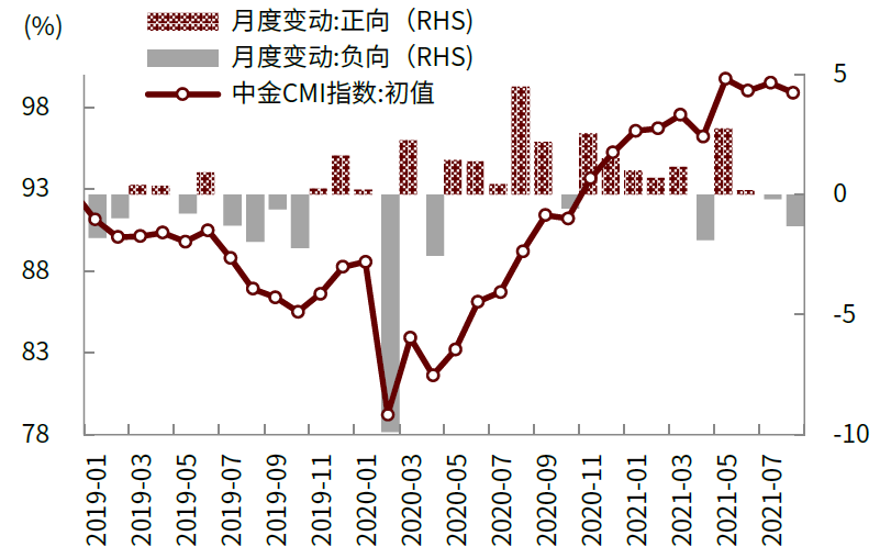 图表:中金CMI数据显示8月份经济仍然偏弱