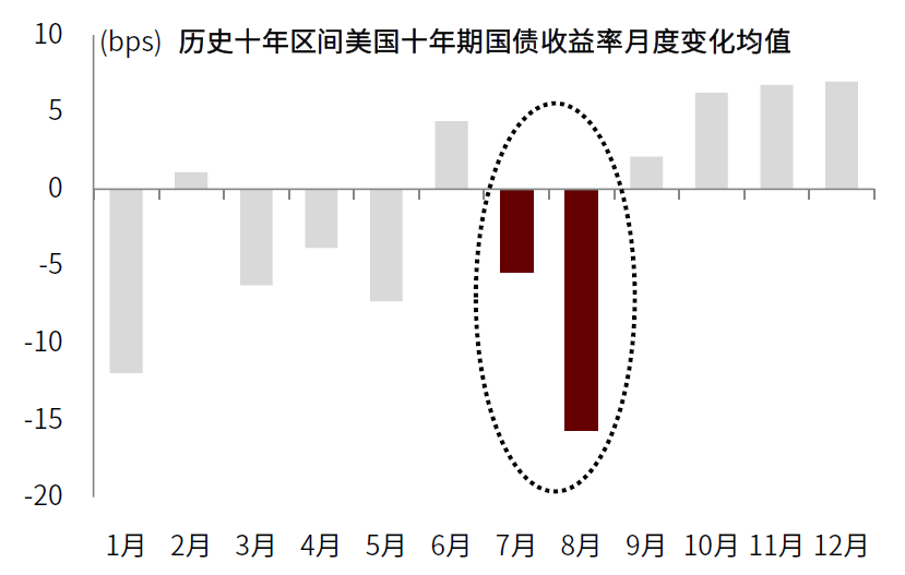 图表:受暑期休假影响,避险仓位压低美债利率,7-8月份美债10年期利率季节性下行