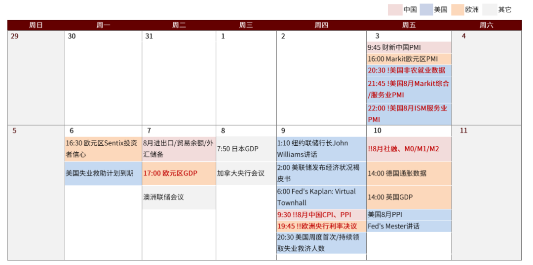 国内:关注本周发布的国内社融信贷数据(8月社融、M0/M1/M2)、进出口和通胀情况。