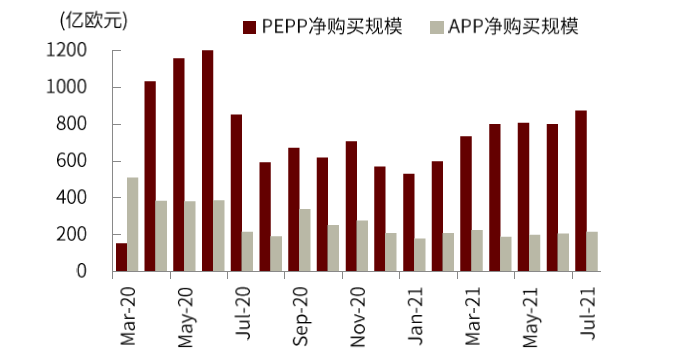 最近市场高度关注美联储Taper动向。事实上美国并非Taper政策的独行者,其他海外央行也在逐步退出宽松政策:我们认为欧洲央行可能在本周四货币政策会议(ECB Meeting)上讨论宽松政策退出,欧洲的Taper风险也在浮现。本次ECB会议的焦点是PEPP资产购买计划(Pandemic Emergency Purchase Program)。为应对疫情冲击,欧央行于去年3月启动PEPP。由于疫情影响超出预期,PEPP的规模目标多次上调,退出时点一再推迟,最新的购买规模目标是1.85万亿欧元。截至2021年7月,PEPP累计净购买规模已达1.27万亿欧元(约68.6%的购买目标),远超同期资产购买计划APP的净购买规模(图表1)。2021年3月,欧央行决定以“明显更快的速度”(significantly higher pace)实施PEPP,资产购买速度上升至800亿欧元/每月(图表1, 图表2)。