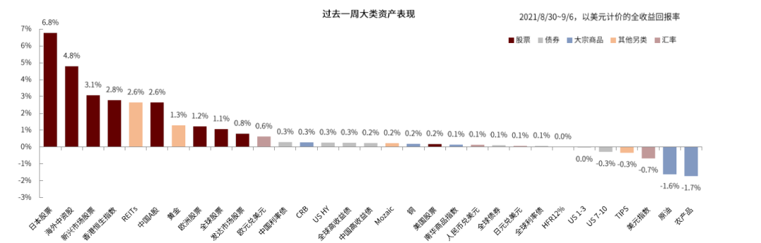 全球大类资产表现回顾(2021/8/30~9/6):过去一周,全球大类资产表现整体排序为股票>商品>债券。