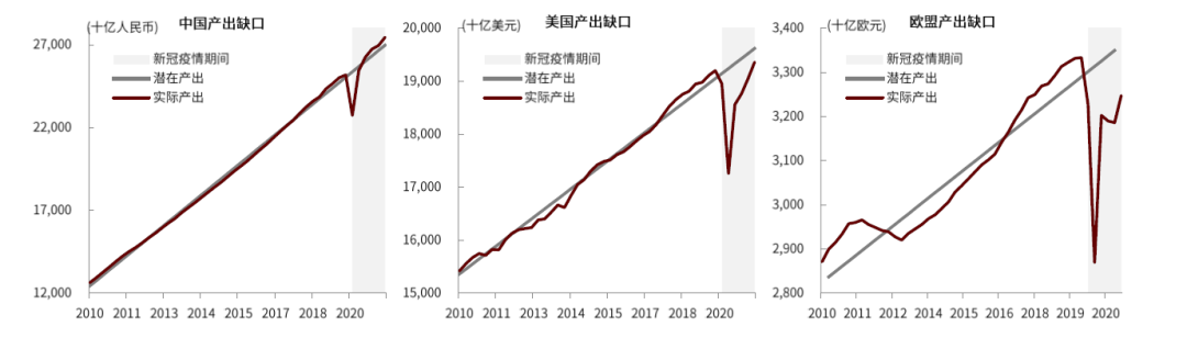 图表9:中国经济已运行至疫情前长期增长路径上方,而欧美仍处于复苏中期,其中欧洲相对美国距离疫情前长期增长路径的缺口增长空间更大