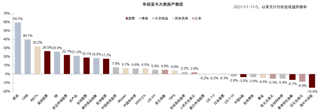 图表58:2021年至今大类资产表现排序(全收益回报率,以美元计价):商品>海外股票>中国债券>中国A股>黄金