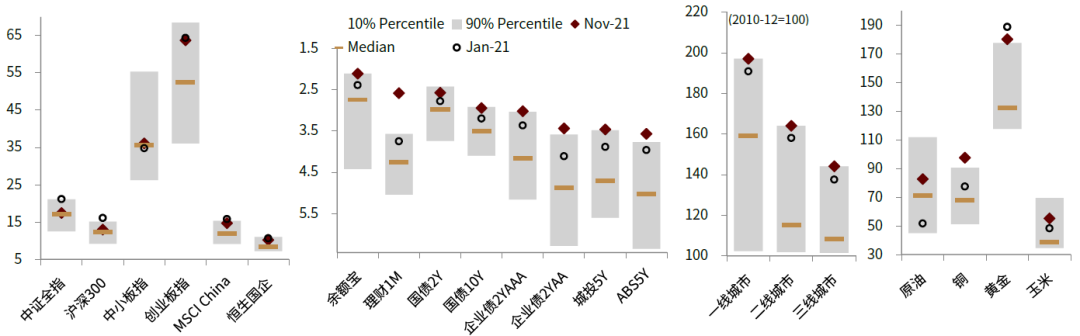 横向比较各类资产估值水平,股票市场的相对吸引力正在提升。当前中国股票资产估值处于历史中值附近,而债券、商品估值处于历史偏高水平,尤其是商品中铜、黄金等品种已经处于历史90%分位数上方。向前看,在均值回归作用下,我们预计商品中部分估值过于极端的品种具有更大的回调风险。