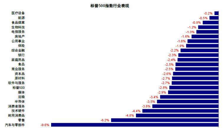 图表3:本周美股分板块来看,汽车、零售、媒体及技术硬件等板块跌幅居前,医疗设备及能源板块跌幅相对较小
