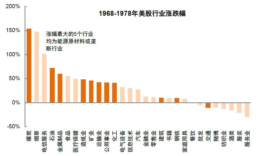 图表:整个滞胀期间,涨幅相对靠前的行业主要是能源和原材料以及部分垄断行业,中下游涨幅相对落后