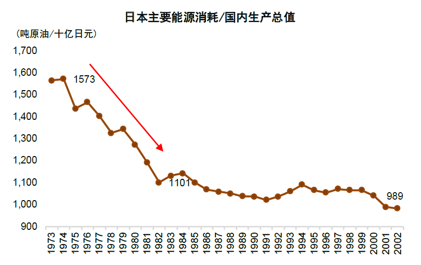 图表:日本单位GDP能耗水平在第一次石油危机之后不断降低