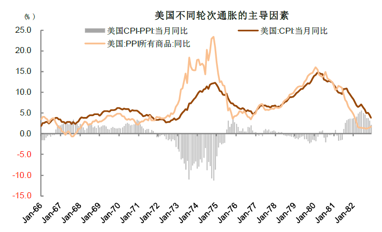 图表:1973-1974年通胀的PPI为主导因素,与1968-1969年和1978-1980年不同