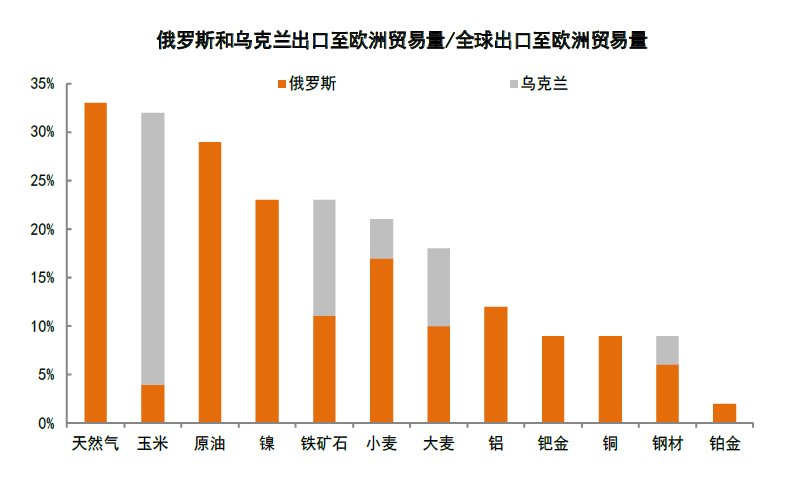 图表:俄罗斯和乌克兰对欧洲主要大宗商品的出口比例同样较高