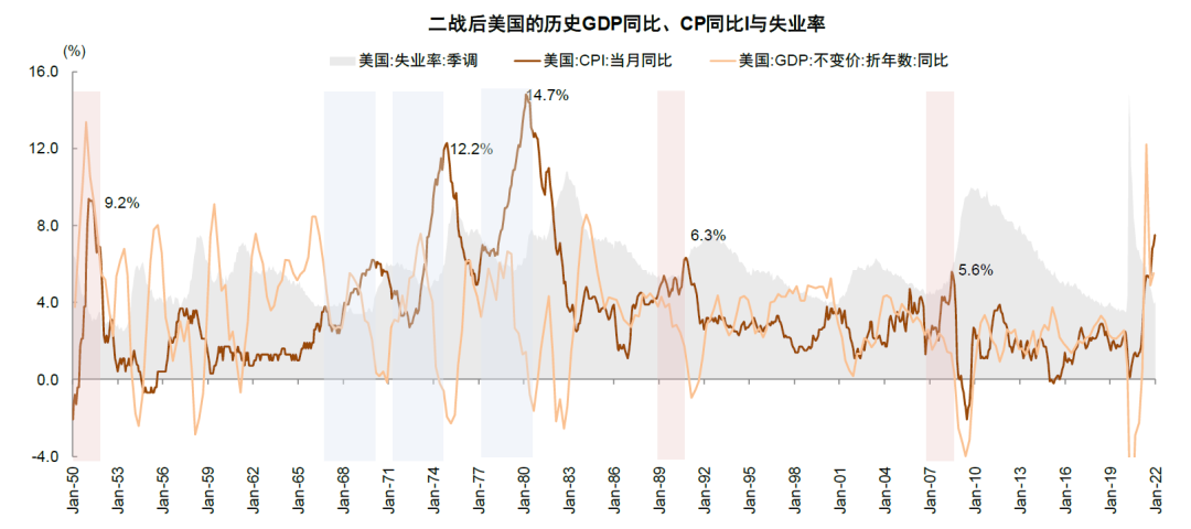 图表:滞胀时期美国GDP低点都在CPI同比见顶回落后1-2个季度出现