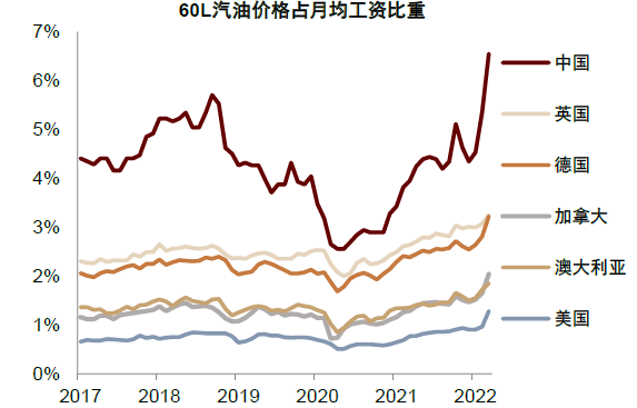 石油是柴油、燃油、汽油等日常交通所需产品油的原料,直接影响居民日常出行成本。原油价格上升,可能导致居民工资收入中用于日常交通的花费上升,叠加通胀上行、服务类价格上涨,从而对其他消费造成挤出效应。今年以来,伴随原油价格上涨,汽油消费占工资比重显著上升。我国汽油价格形成机制较为特殊。根据现行《石油价格管理办法》[1],当国际市场原油价格低于每桶40 美元(含)时,按原油价格每桶 40 美元、正常加工利润率计算成品油价格;高于每桶 80 美元时,开始扣减加工利润率,直至按加工零利润计算成品油价格;高于每桶130美元(含)时,按照兼顾生产者、消费者利益,保持国民经济平稳运行的原则,采取适当财税政策保证成品油生产和供应,汽、柴油价格原则上不提或少提。由于价格调控机制存在,与海外相比,虽然油价成本占我国居民工资比重更大,但价格变动更小,冲抵了油价大涨对我国消费的影响。