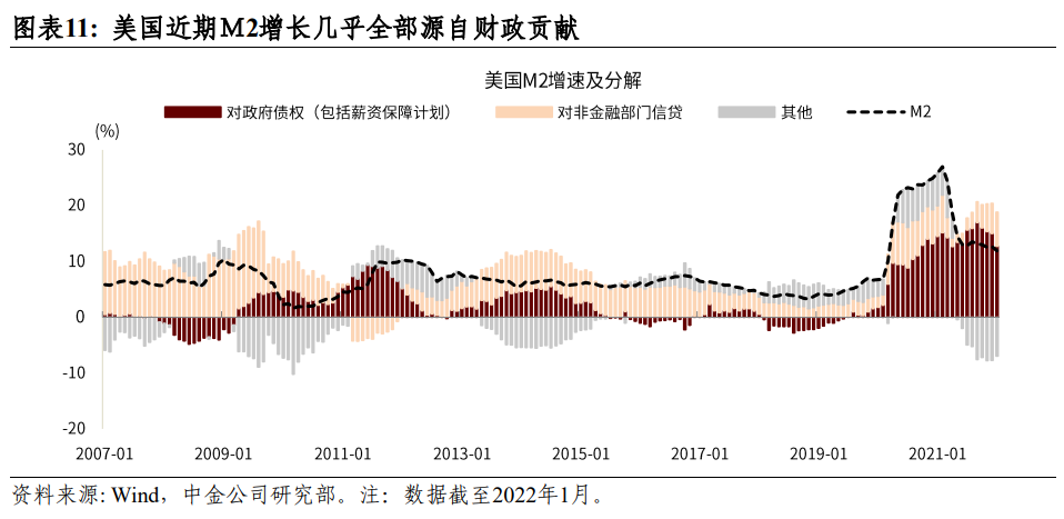 美国M2同比增速2020年高点达到27%,目前仍有13%,而且其M2增长几乎都是由财政赤字扩张贡献的(图表11)。财政扩张推动M2增长对经济和通胀的影响有4~8个季度的时间差,现在的M2高增长对明年甚至明年下半年的通胀仍会有影响。看美国居民部门净资产的变化,2008年金融危机导致居民部门净资产下降,当时的财政赤字主要用来救助金融机构。新冠疫情冲击之下,财政扩张主要用来救济居民部门,所以居民部门净资产上升,增幅达到20%以上(图表12)。