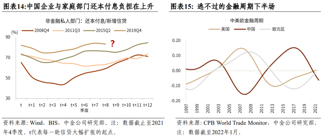 除非不断加速信贷扩张,否则存量债务还本付息的负担与新增信贷之比越来越高,终归是个问题。用发新贷款解决旧贷款的偿还问题,实际上是饮鸩止渴,这是我们现在面临的问题。中国面临的问题不只是疫情造成的,经济处在金融周期下行阶段,面临房地产降温、债务风险暴露和处置等问题。欧美在金融周期的上行阶段,已经经过下行的调整,财政再发力,促进了私人部门的财务状况改善(图表15)。