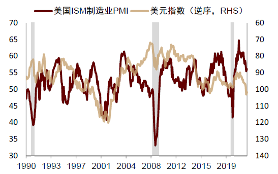 图表:海外营收占比越高的行业,受美国经济基本面影响越大