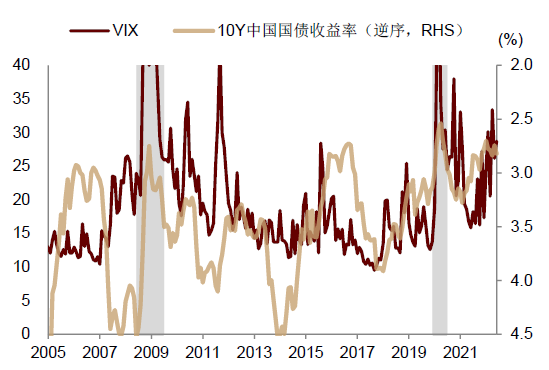 如果海外衰退对金融市场造成较大冲击,明显推高避险情,则会导致VIX上升,美元走强。避险情绪有利于中国国债等避险资产的表现,但会对中国股票等风险资产形成压制。