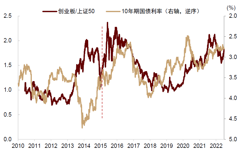 图表:创业板/上证50与10年期国债利率负相关性在2015年后加强