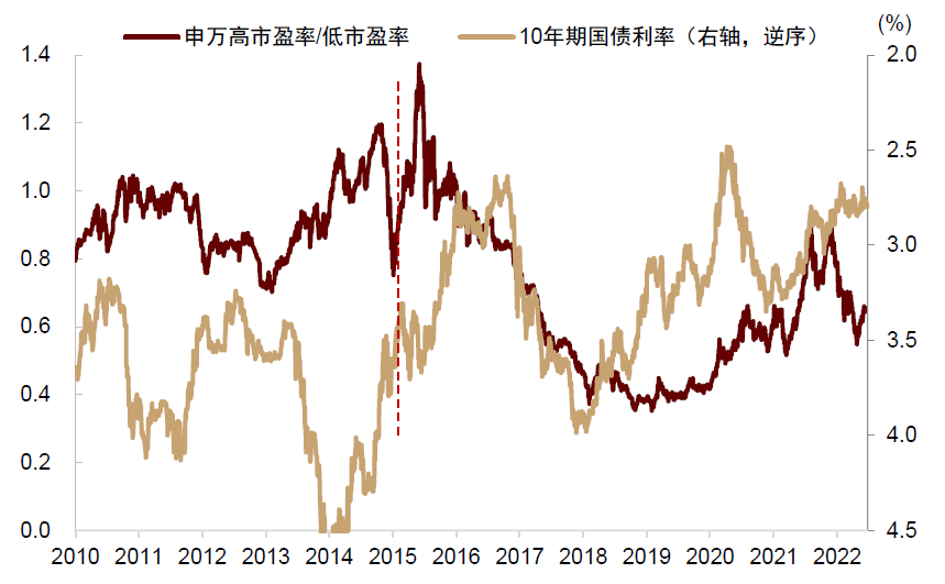 图表:高市盈率指数/低市盈率指数与10年期国债利率负相关性在2015年后加强