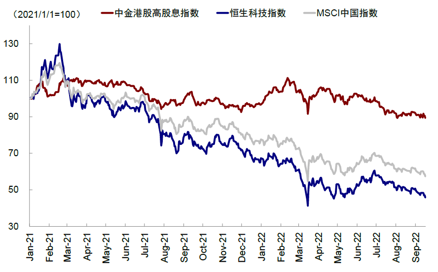 图表:…港币计价的高股息标的亦是如此,港股高股息指数大幅跑赢恒生科技及MSCI中国指数
