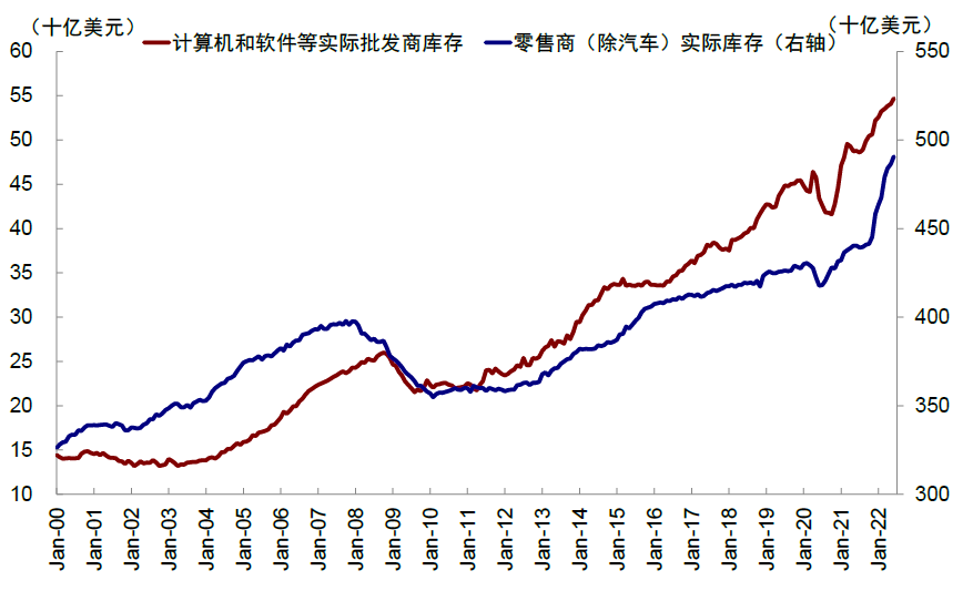 2)经常帐下美国进口需求回落和逆差减少(美国全社会实际库存已经回到疫情前,部分消费端行业如零售和半导体库存已经过剩);