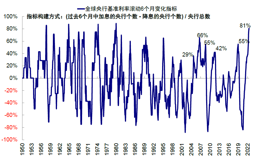图表:当前全球进入加息周期的央行占比已达到81%,为1980年以来最高