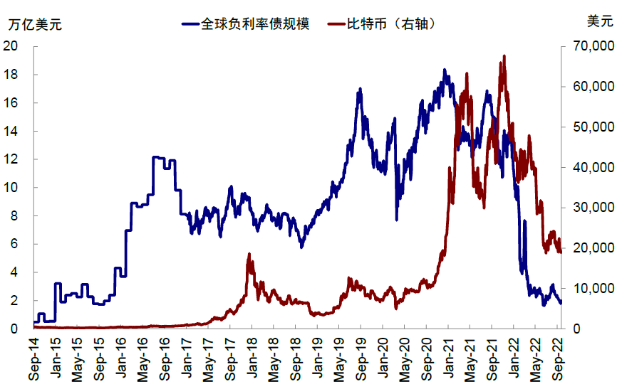 图表:比特币同样是无现金流资产,负利率债券规模的下降伴随其近期的持续下跌