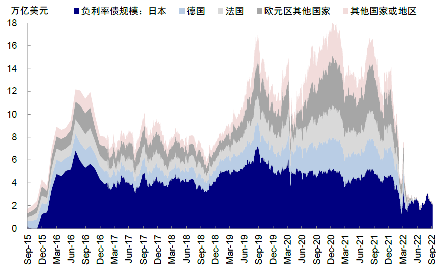 图表:全球负利率债券规模从2020年底的18万亿美元降至当前的2万亿美元