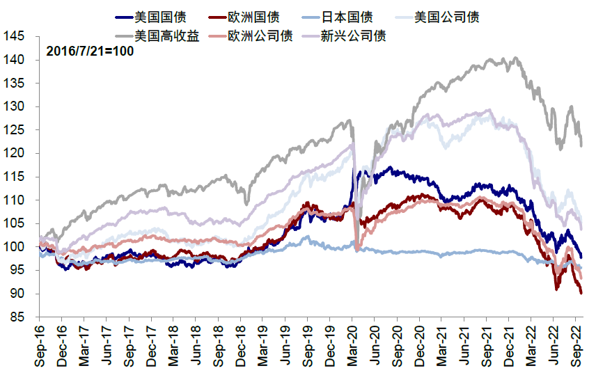 美联储在9月FOMC会议上的鹰派姿态引发了新一轮全球流动性、特别是美元流动性的紧张(《加息的终点:更高但能否更远?9月FOMC点评》、《全球美元流动性或进一步收紧》)。美元指数突破113,创2002年以来的新高;美债利率特别是实际利率创出1.3%的2010年4月以来新高,二者均是较为显性且直接的体现。种种迹象都表明,美国以外的离岸美元变得更贵且更少(全球负利率债券规模从2020年底的18万亿美元降至当前的2万亿美元),即我们此前提示的全球“便宜钱”消失(《“便宜钱”消失的加速器:美联储缩表提速》、《“便宜钱”消失的全球资产定价影响》)。