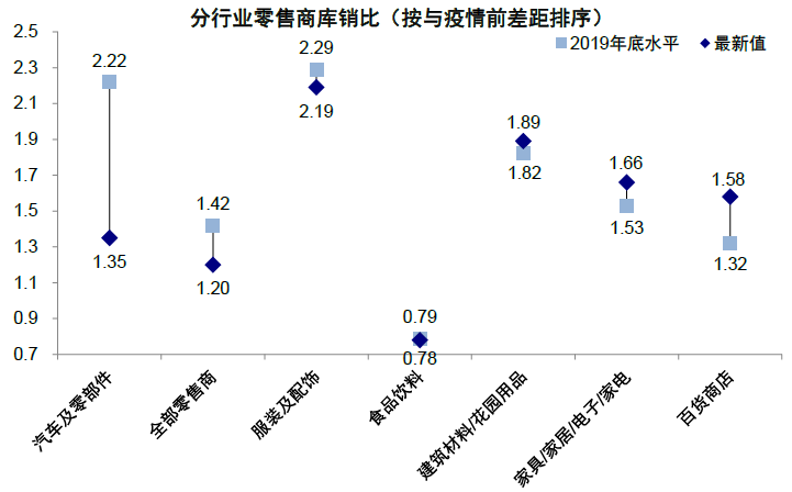图表:截至7月,除汽车及零部件和服装配置外,零售商库销比基本都回到了疫情前水平