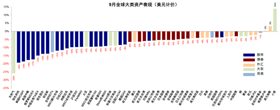 图表:9月,美元计价下,债>大宗>股;小麦、美元指数上涨,天然气、恒生科技、韩国股市等领跌