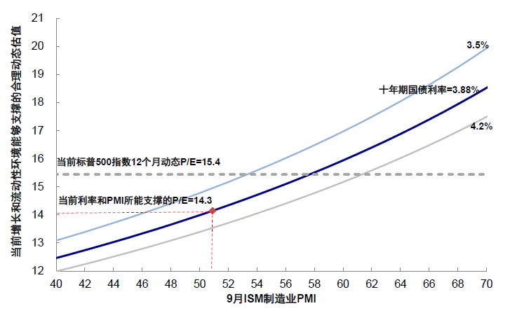 图表:当前增长和流动性能够支撑的标普500指数合理估值水平约14倍左右