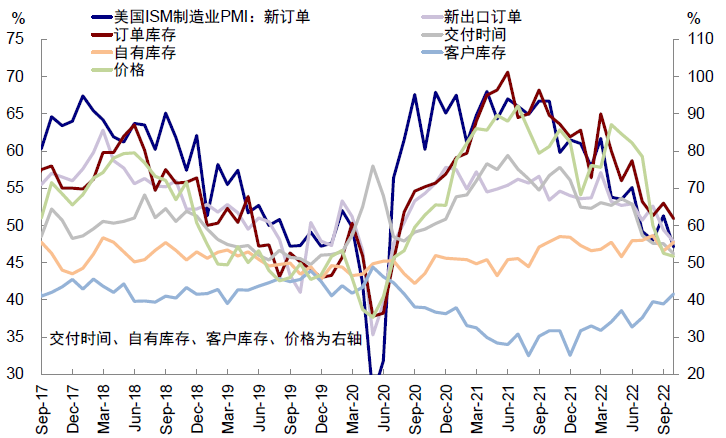 图表:9月ISM制造业PMI进一步回落;从分项来看,需求回落、物价和交付改善、库存抬升