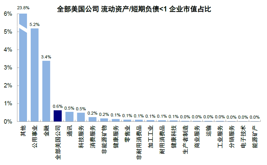 图表:美国上市公司流动资产/短期负债小于1市值占比仅0.6%,这表明风险敞口更多集中小企业