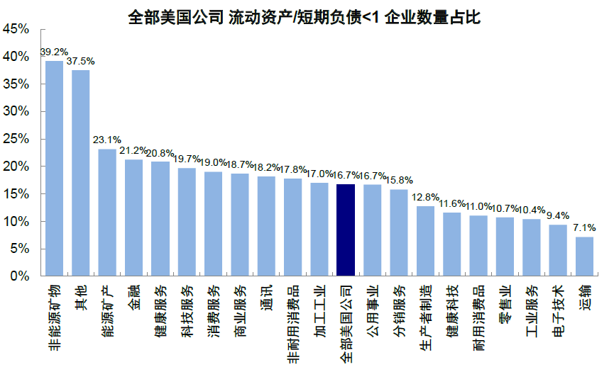 如果以流动资产/短期负债监测企业短期流动性压力,我们发现美国上市公司中16.7%的企业这一比例小于1,以能源、原材料、消费服务居多;但市值占比仅为0.6%,表明风险敞口更多集中在小企业。