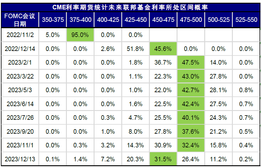 图表:CME利率期货显示11月加息75bp基本“板上钉钉”(95.0%),12月加息75bp概率也在持续升温
