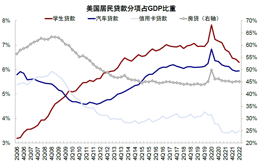图表:虽然疫情后回落明显,但汽车贷款和学生贷款占比仍远高于2008年次贷危机水平