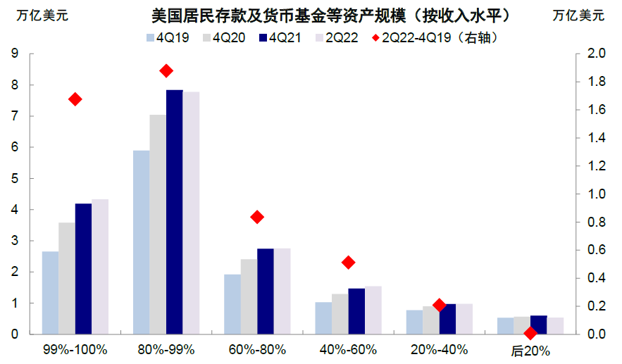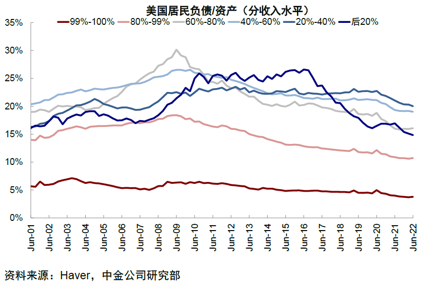 不过存在结构分化。首先,从不同收入群体看,中低收入人群杠杆最高。1)高收入人群资产增幅高,杠杆低。截至2Q22,收入前20%居民现金类资产(储蓄及货币基金)约12.1万亿美元,较2019年四季度增长41.6%;杠杆(负债/资产)仅8.8%,其中收入在前1%的居民资产增幅63.7%,杠杆仅4.1%。2)中等收入人群杠杆较高。收入分位在20%~80%的居民现金类资产约52.8万亿美元,较2019年四季度增长41.8%,与高收入人群资产增速基本相当;但杠杆更高(18.2%),其中收入分位20%~40%居民杠杆20.1%,2008年以来并未明显降低。3)低收入人群资产基本没有增长,但负债不高。收入分位在后20%的居民现金类资产仅0.54万亿美元,较2019年四季度基本维持不变;但杠杆为13.8%。